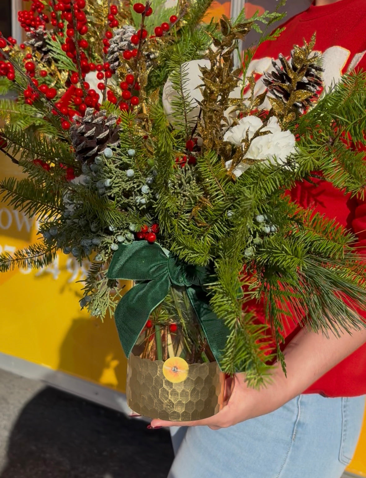 Nuestro famoso bouquet mixto confeccionado en la base de cristal Gold Cylinder.