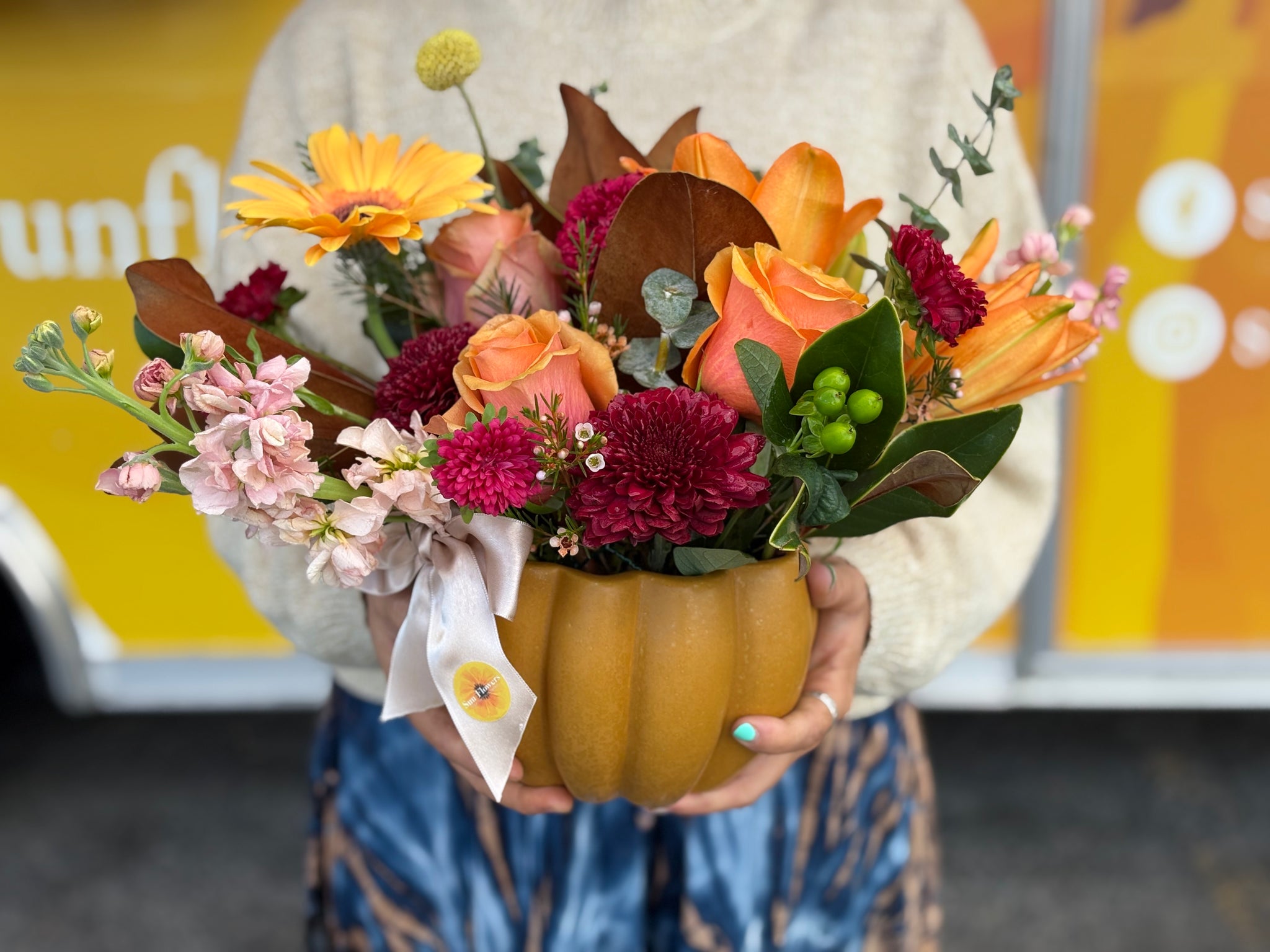 Nuestro famoso bouquet mixto confeccionado en la base de cerámica Pumpkin vase