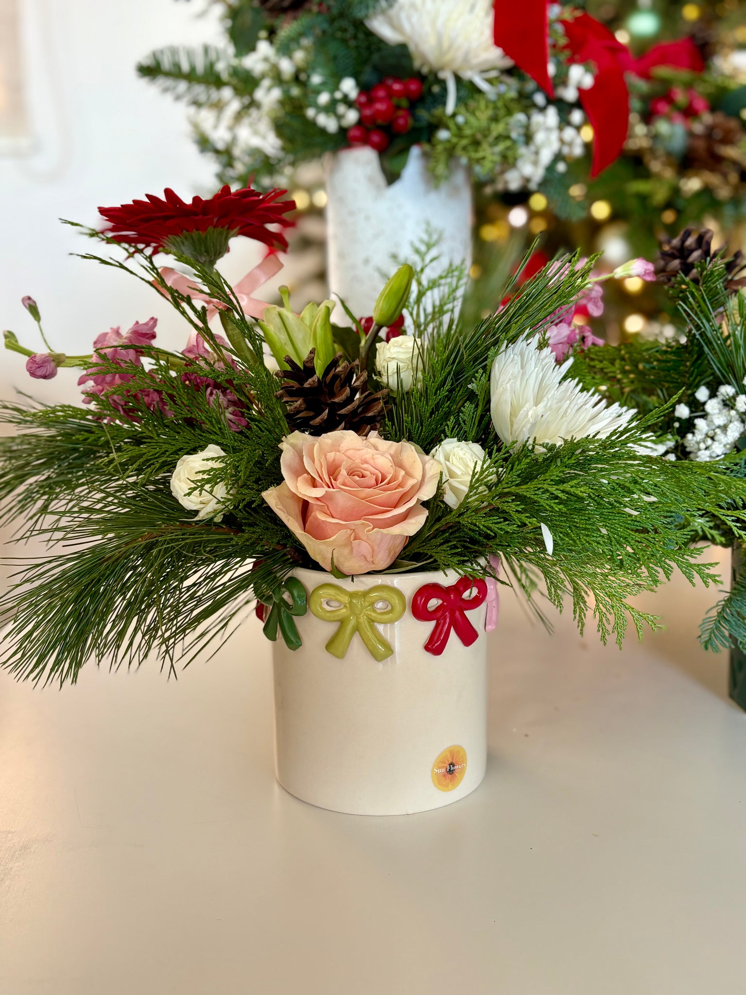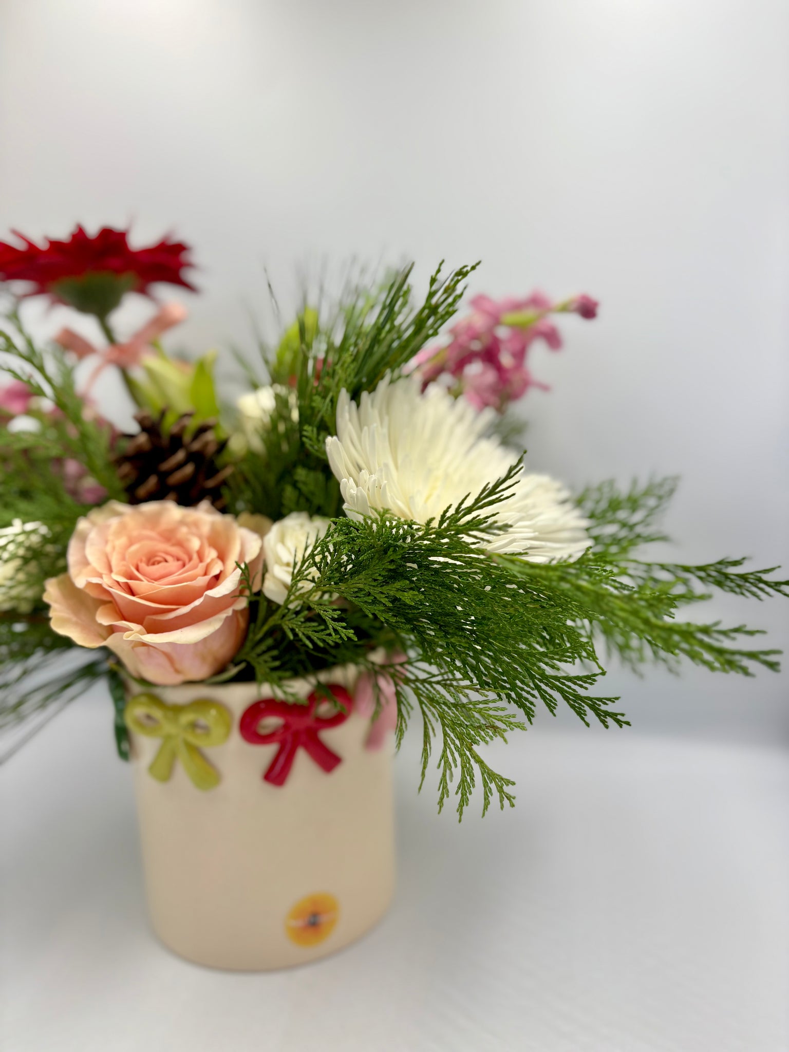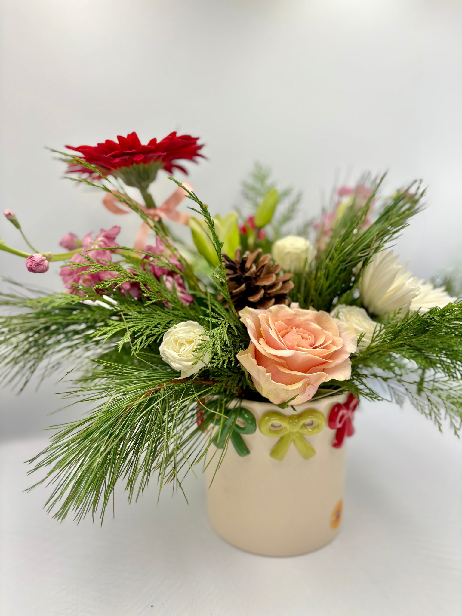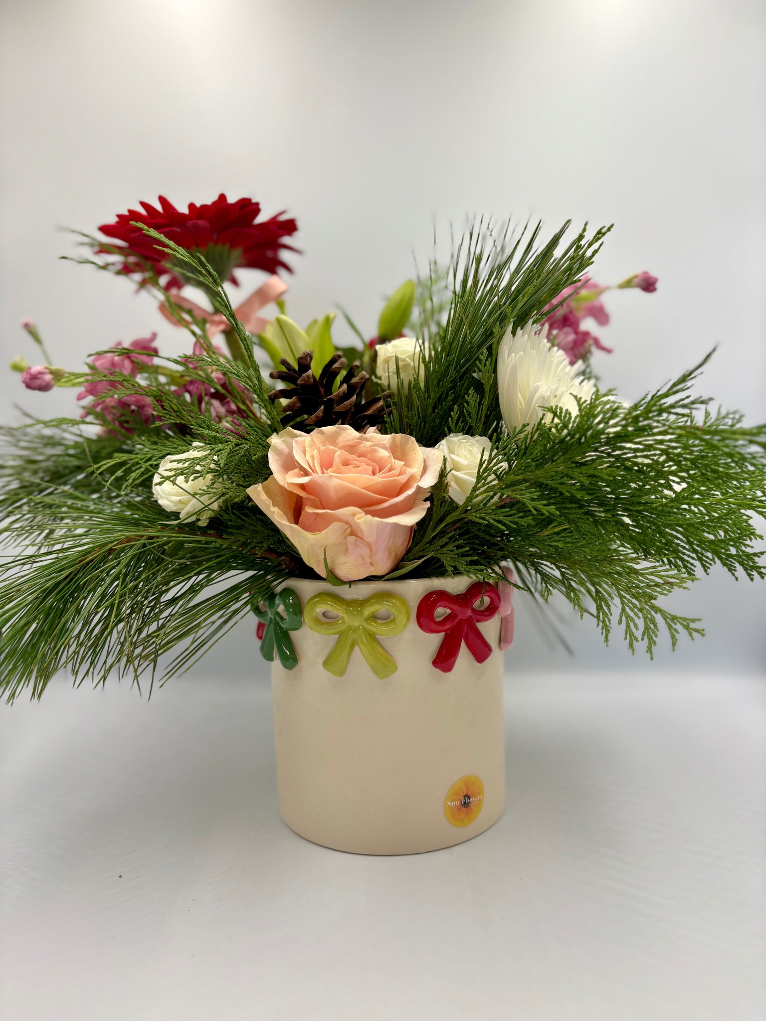 Un arreglo que captura la ilusión de las fiestas con pequeños detalles que hacen GRAN diferencia. Merry Little Bows combina flores frescas de temporada —en rojos vibrantes, verdes acogedores y toques blancos invernales— con una selección de follajes festivos que aportan textura y movimiento. Su base crema adornada con lacitos de colores añade dulzura y nostalgia: como esos regalos bajo el árbol que uno no puede esperar para abrir. Es el detalle perfecto para sorprender a quienes llenan tu vida de alegría o decorar ese rincón especial en casa que pide un toque navideño encantador.
